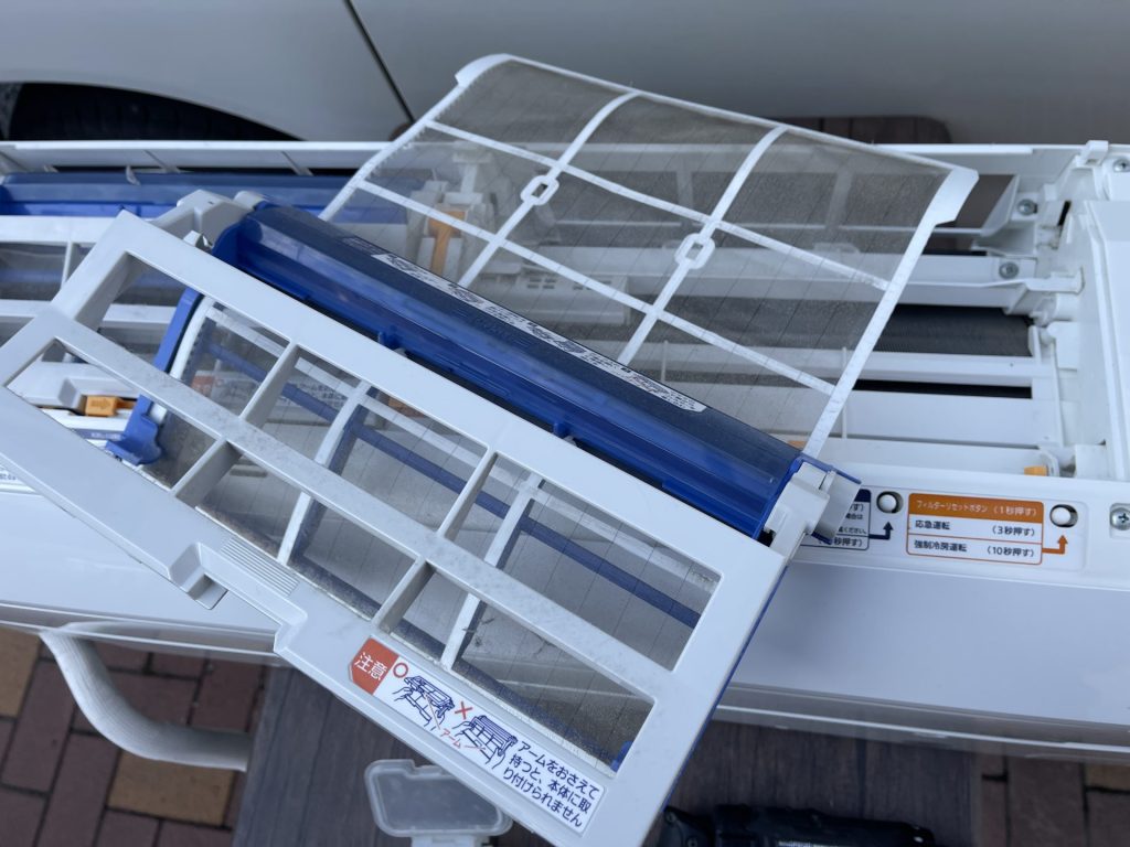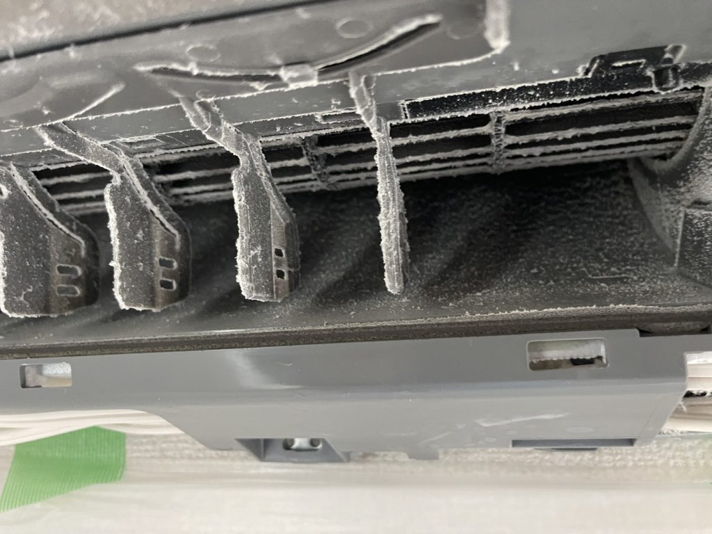 基本的なのですが、とても重要なのが『フィルターの掃除』です。フィルターの役割はホコリなどの吸引物をエアコン内部に入り込まない様にするものなのですが、稼働しているとホコリや油などでだんだんと詰まっていきます。特にキッチン近くのエアコンだと写真の様に油がびっしりとついていることも多いです。フィルターが詰まっていると空気がちゃんと吸えず、冷えない原因になりやすいです。ホコリだけなら掃除機で吸引し、写真の様に油で目詰まりしているならキッチンマジックリンなどの『油汚れ用洗剤』で洗いよく乾かしてから取り付けてください。エアコンをよく使う時期は2週間に1回程度がおすすめです。お掃除機能付きエアコンもフィルターは必ず洗ってくださいね。