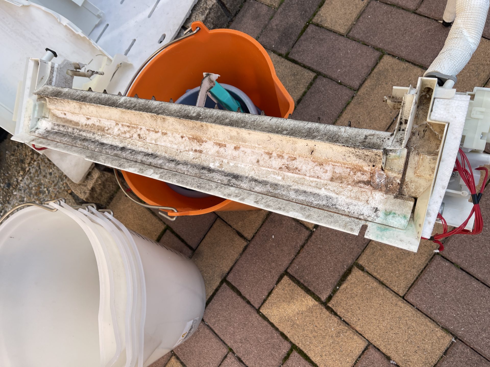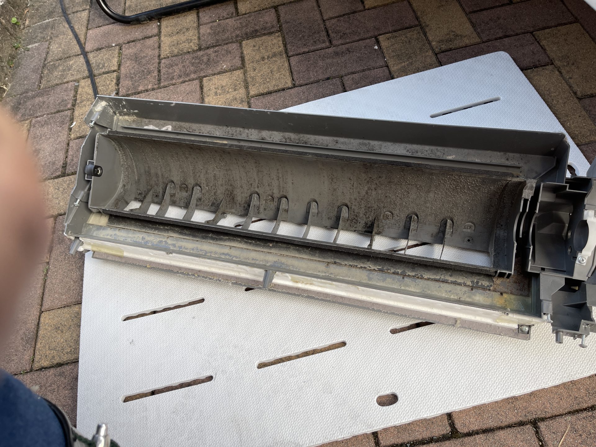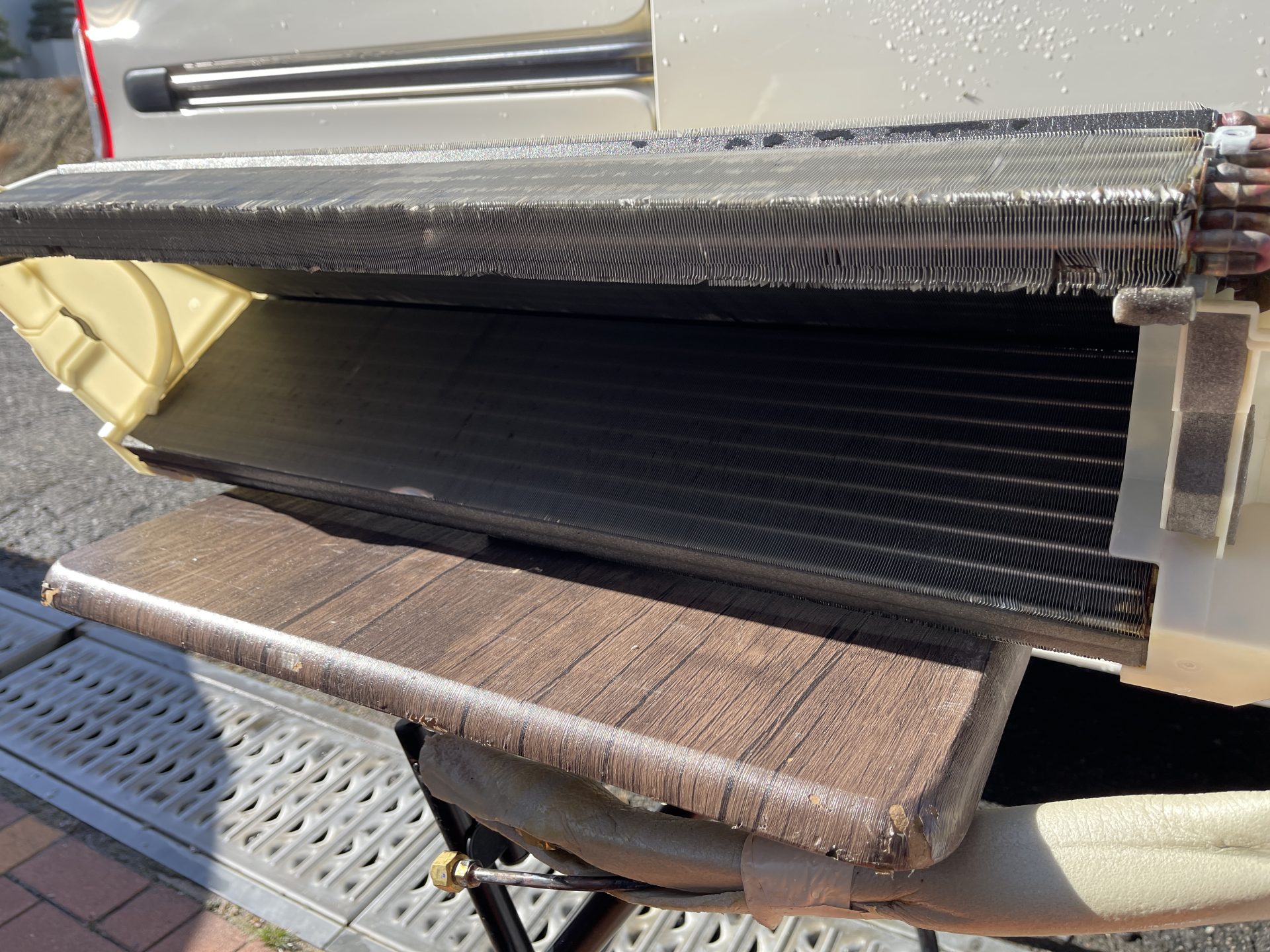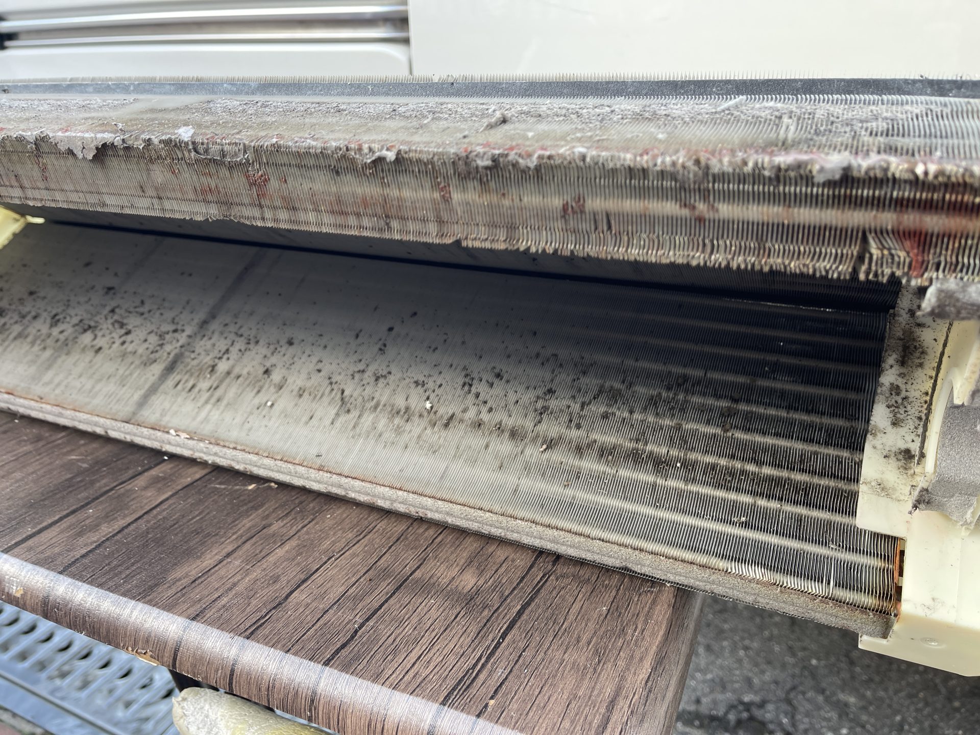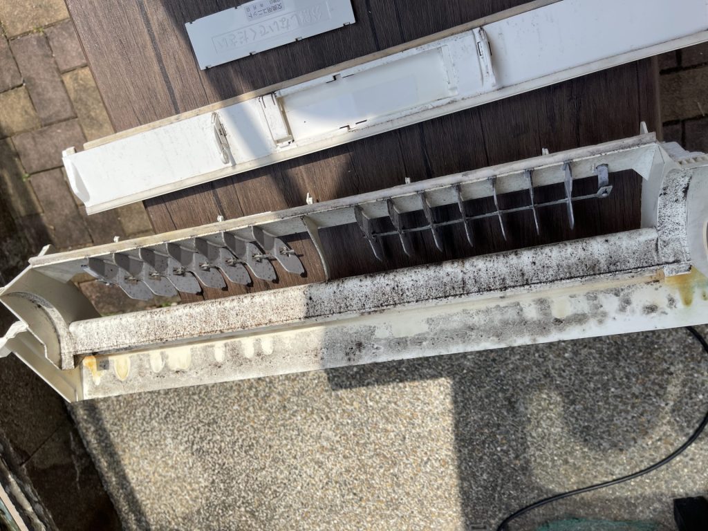 『エアコン完全分解クリーニング』の強みは何といっても、壁に掛けたままでは見えない汚れまでスッキリする事です。通常の壁掛けクリーニングでは水が当たらない、当たっても弱いという場所が複数存在します。そういった奥の場所、パーツのかみ合わせ部分まで汚れを落とすことが可能です。